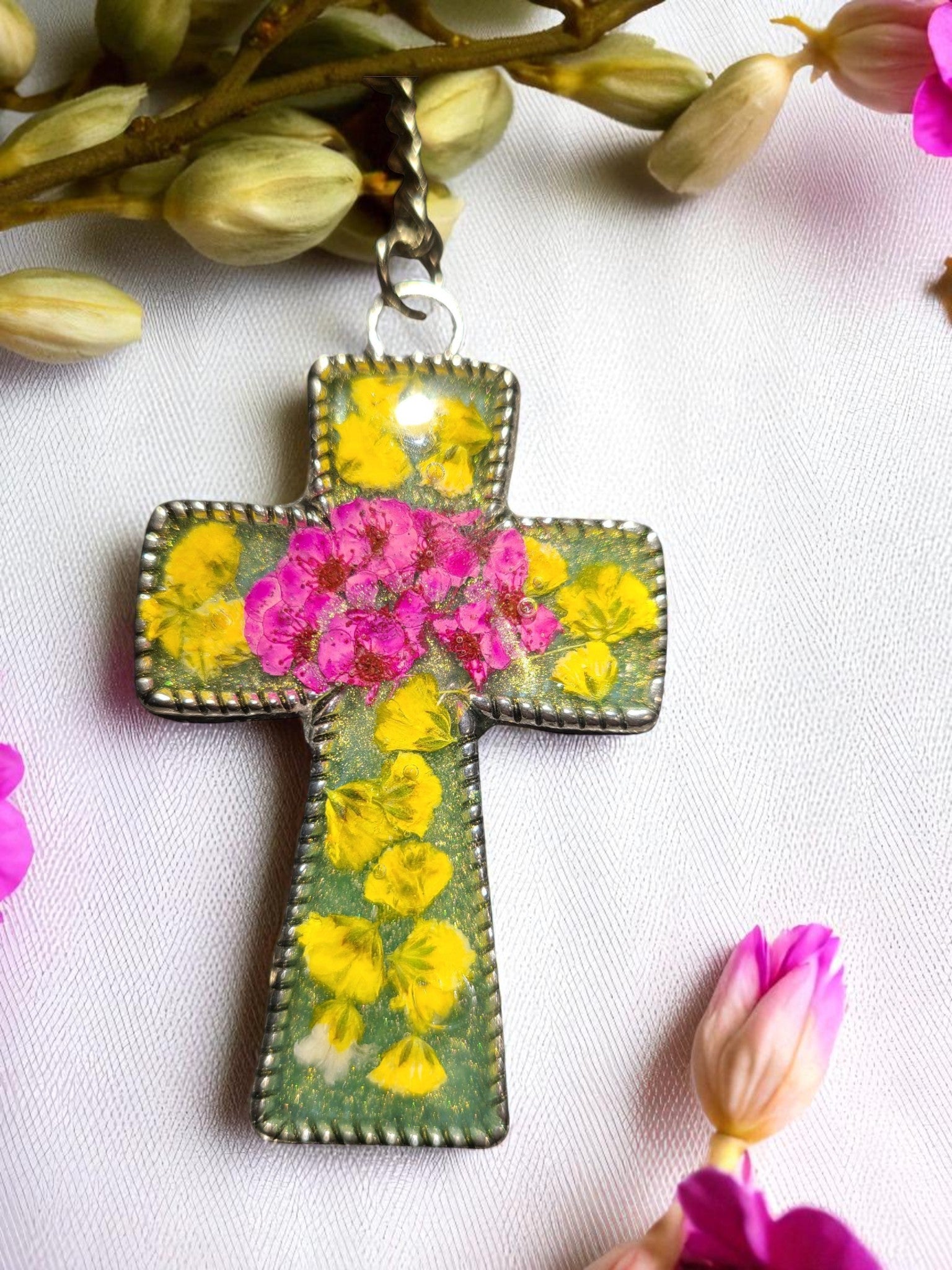 Elevate your everyday accessories with our luxurious Silver Cross Keychain. Each featuring real flowers delicately set in resin, our keychain is a beautiful blend of nature and modern style. Perfect for fashion-forward individuals looking for a sophisticated and exclusive touch to their daily essentials.