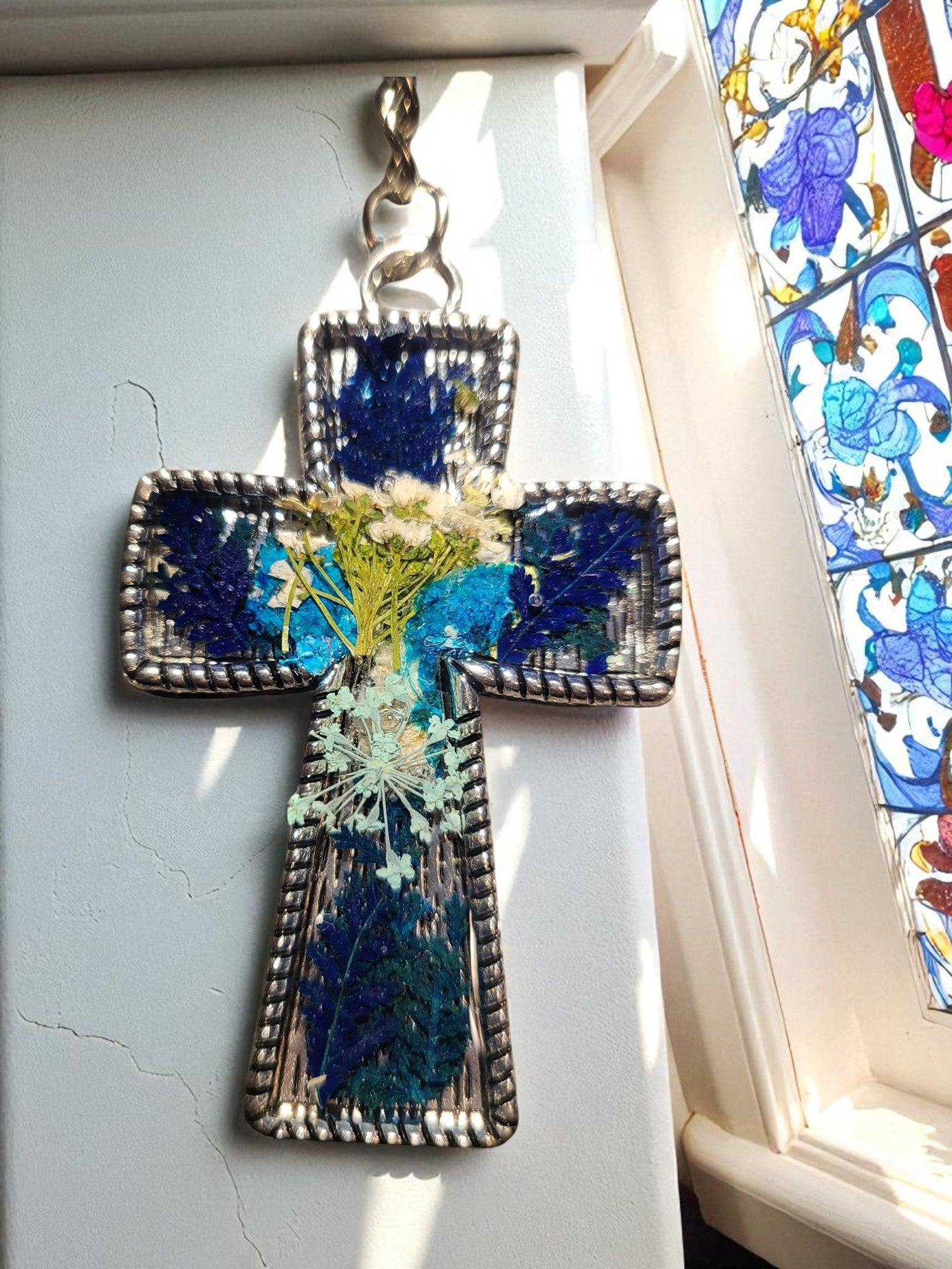 "Add a touch of nature to your everyday accessories with our new Silver and Resin Keychain featuring real flowers. The perfect combination of beauty and functionality, this keychain will make a unique and eye-catching addition to your keys. Inspire awe and showcase your love for nature with every use!"Fall in love with our stunning New Product! Its silver cross is adorned with delicate, real flowers set in resin, creating a unique and eye-catching statement piece. Embrace its beauty and add a touch of elegance to any outfit. Limited quantities available, so get yours now!
